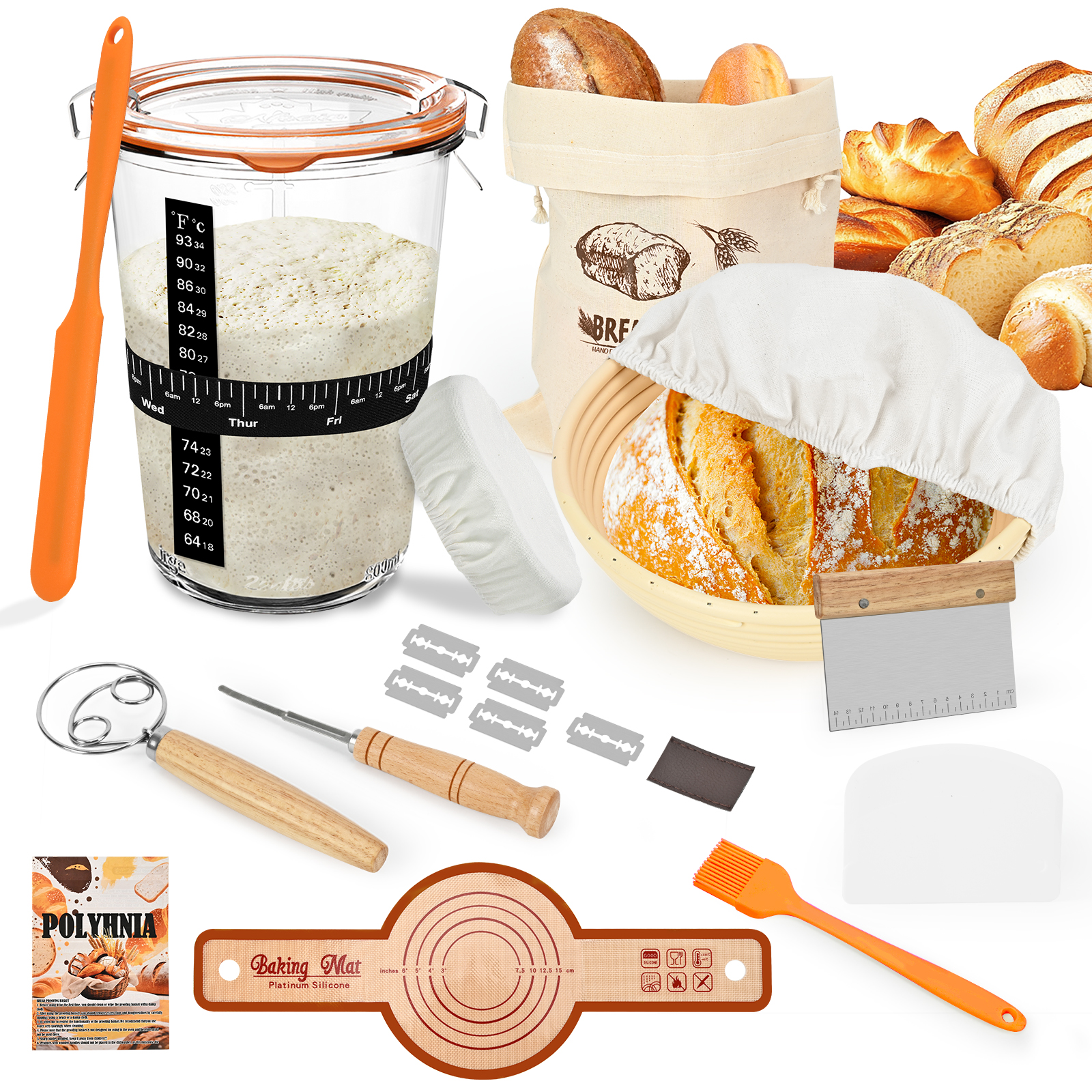 + Free Shipping- Simplify your production process-Everything you need included: Sourdough Starter Jar × 1,Silicone Stirring Spoon X 1,Temperature Bar X 1,Glass Lid with Airtght X 1,Cloth Cover X 1,Feeding Band X 1,Buckles X 2,Silicone Bread Slng X 1,A 9-inch PP Material Proofing basket X 1,Cutting blade+Blade Cover X 1,Replace the blade X 4,Dough Whisk X 1,Silicone oil brush X 1,Bowl Scraper × 1,Instruction Manual × 1,Stainless Steel Scraper X 1,Reusable Bread Bag X 1,Designed to let you enjoy the fun of baking and the beauty of life without any unnecessary steps