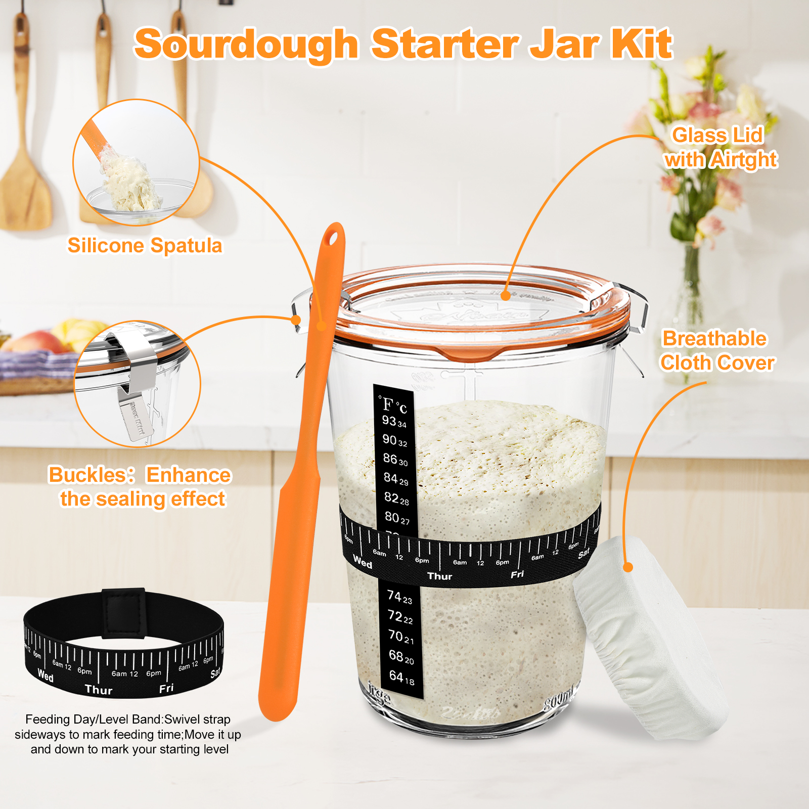 - Sourdough Starter Kit:The sourdough bread jar for sourdough starter is designed with a wide mouth, so you can easily add flour and water into the glass jar.The sourdough starter jar glass makes it effortless to stir, feed,and maintain the starter,enhancing your natural fermentation experience. The jar for sourdough starter made from Thicker!!glass which makes cleanup easy,either by hand or in the dishwasher. Finally,our sourdough jars have no creases,bends,or pits inside,which will allow you to mix the fermentation efficiently